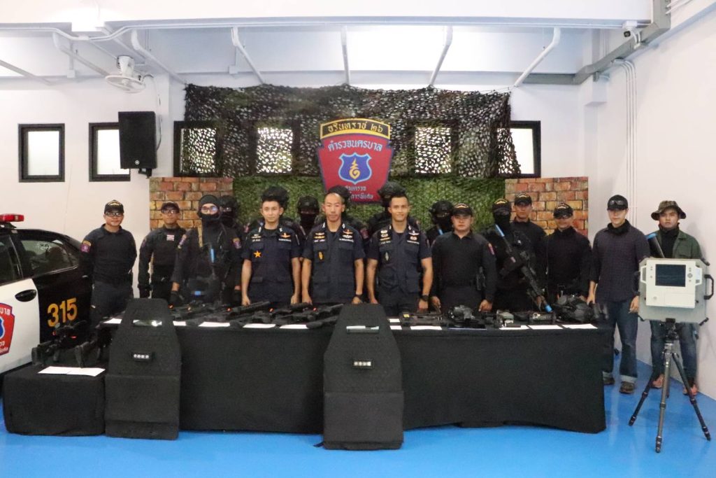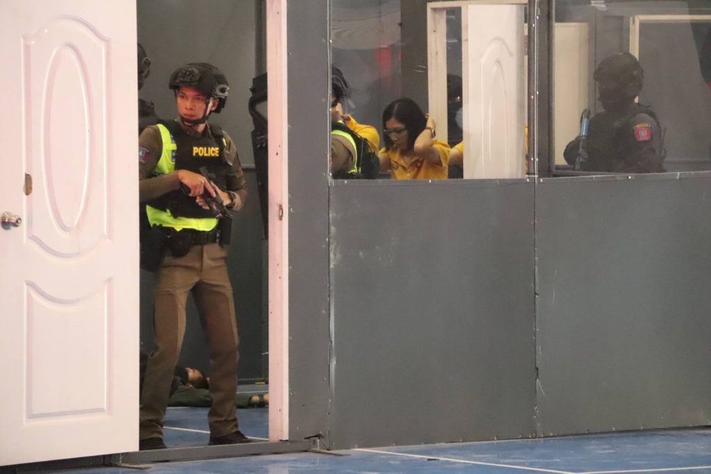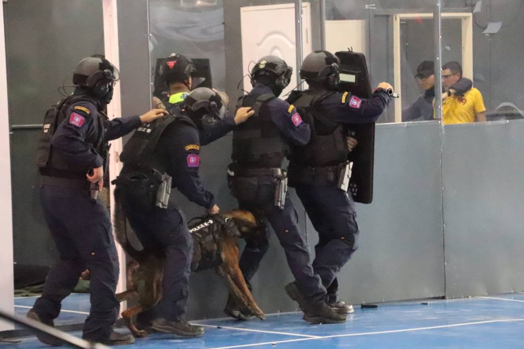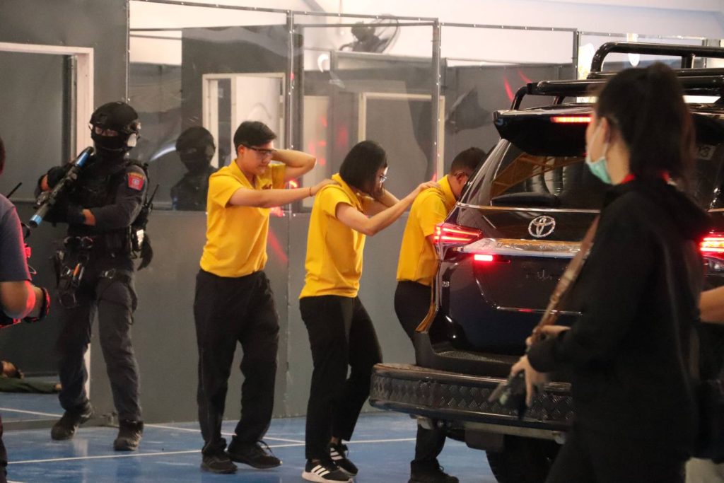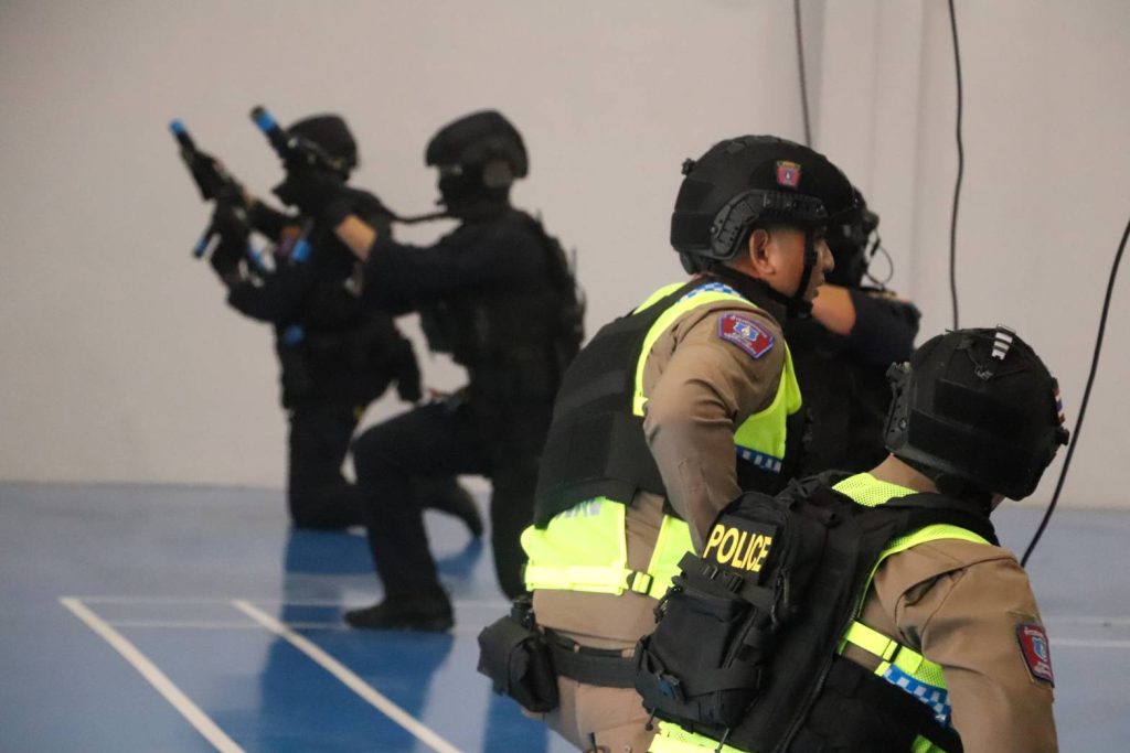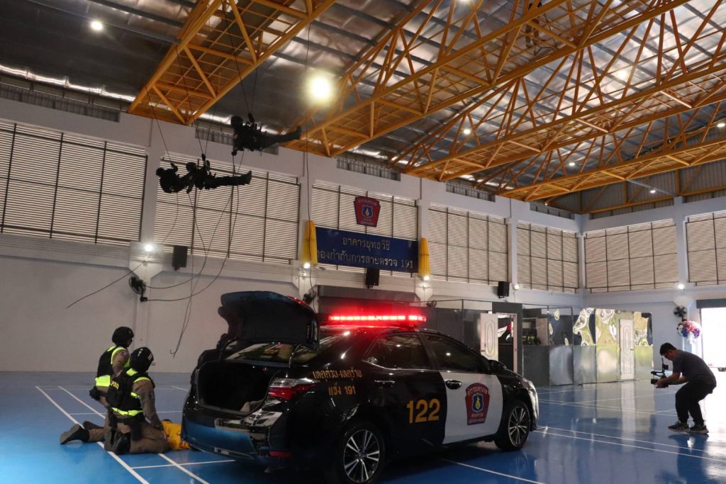 จากนั้นได้ชมการแสดงสาธิต การปฏิบัติการทางยุทธวิธีในการเผชิญเหตุและระงับเหตุ โดยจำลองสถานการณ์กลุ่มคนร้าย ได้รับแจ้งเหตุคนร้ายจับประชาชนเป็นตัวประกัน อีกทั้งมีวัตถุต้องสงสัย ทางเจ้าหน้าที่สายตรวจจึงไปตรวจสอบเพื่อประเมินสถานการณ์ ก่อนประสานชุดปฎิบัติการเข้าระงับเหตุโดยใช้ยุทธวิธีแอคทีฟชูตเตอร์